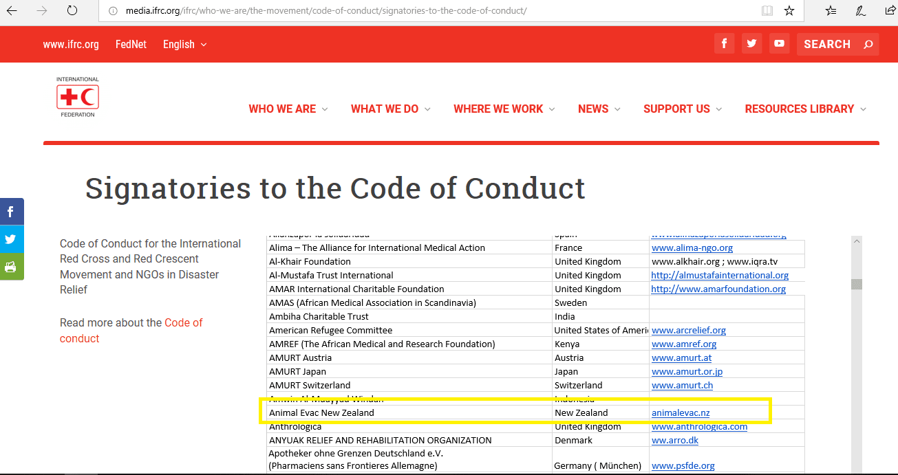 Animal Evac New Zealand became the first New Zealand based animal charity to become a signatory to the Code of Conduct for the International Red Cross and Red