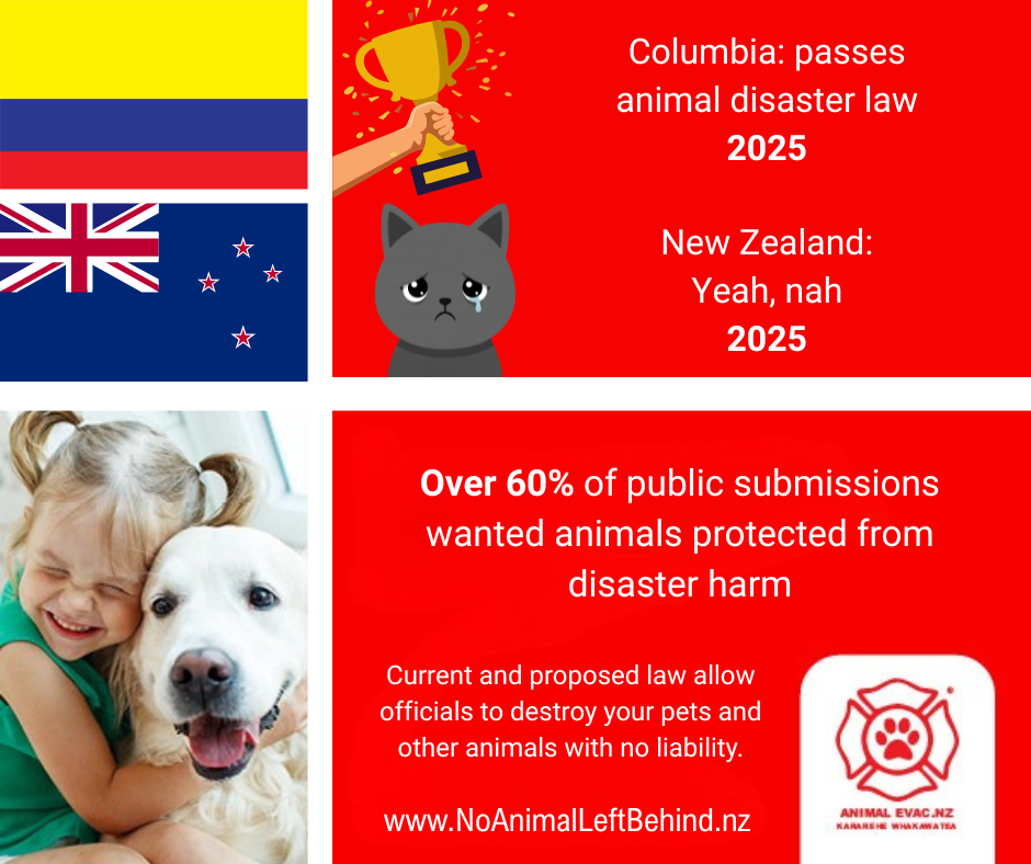 Though there are some significant questions around genuine public participation in the consultation process, and concerns around transparency and accountability, our focus is supporting the Governance and Administration Select Committee (GAC) with empirical advice based on published studies – not opinion or agendas. We as Kiwi’s have a once in a lifetime opportunity to lead the world, developing gold standard emergency management law that protects animals from disaster harm. Congratulations to the Government of Columbia! Can we do better than Columbia for our animals? It would be un-kiwi not to.